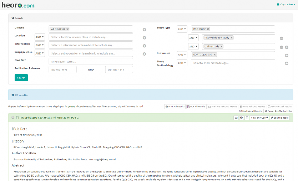 At ISPOR DC, we were asked "Has the EORTC tool been mapped to utility values in cancer?" Here's how to use heoro.com to answer that question. One of the many questions we were asked at ISPOR DC last week was "Can the database help me find out whether the EORTC tool has been mapped to utility values?" Here's how we can answer that question: 1. Log into www.heoro.com and go to the Dashboard. 2. Add "All Diseases" to the first, Disease, selection box (the first term in the menu that appears in that box). 3. In the study type selection box, add "PRO Study" from the menu. 4. Select "EORTC QLQ-C30" from the Instrument menu. 5. Add another row to the Study type options using the + button next to PRO Study. 6. Select "PRO Validation study" from the options - this study type includes studies validating a PRO instrument, or mapping one instrument to another. 7. Add another row to the Study type options using the + button next to PRO validation study. 6. Select "Utility study" from the options. Heoro.com will find studies in our database that map the EORTC QLQ-C30 to instruments used to determine utility values.